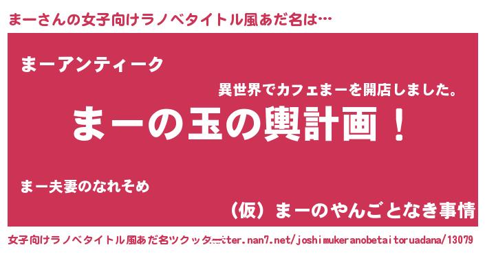 | 男性向けラノベタイトル風あだ名 | 『まー~年齢イコール彼女いない歴の魔法使い~』 |
