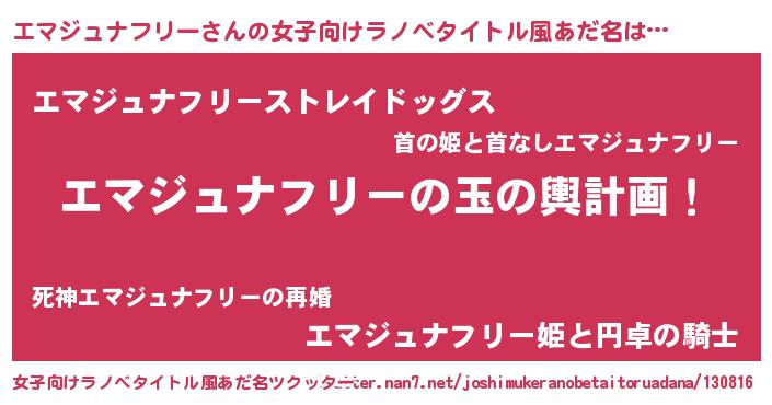 | 男性向けラノベタイトル風あだ名 | 『エマジュナフリー~年齢イコール彼女いない歴の魔法使い~』 |