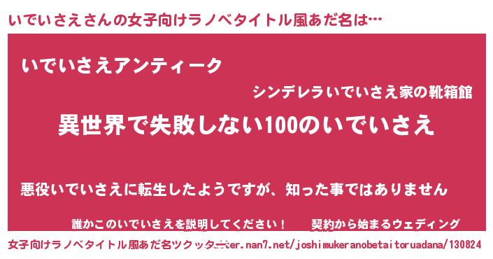 いでいさえさんの女子向けラノベタイトル風あだ名は… 『異世界で失敗しない100のいでいさえ』『いでいさえアンティーク』『誰かこのいでいさえを説明してください! ~契約から始まるウェディング~』 ツクッター #女子向けラノベタイトル風あだ名ツクッター http://tkutter.nan7.net/joshimukeranobetaitoruadana/130824/