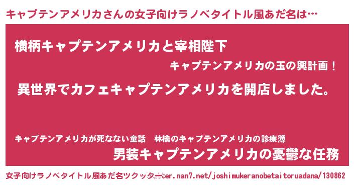 | 男性向けラノベタイトル風あだ名 | 『誰もが恐れるあのキャプテンアメリカが、ぼくの専属メイドになるようです。』 |