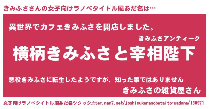 | 男性向けラノベタイトル風あだ名 | 『きみふさに滅ぼされるだけの簡単なお仕事です』 |