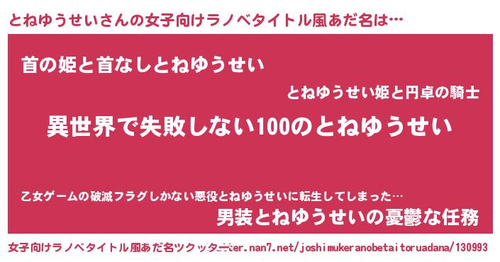 とねゆうせいさんの女子向けラノベタイトル風あだ名は… 『異世界で失敗しない100のとねゆうせい』『首の姫と首なしとねゆうせい』『男装とねゆうせいの憂鬱な任務』 ツクッター #女子向けラノベタイトル風あだ名ツクッター http://tkutter.nan7.net/joshimukeranobetaitoruadana/130993/