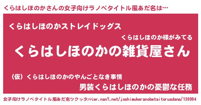 くらはしほのかさんの女子向けラノベタイトル風あだ名は… 『くらはしほのかの雑貨屋さん』『くらはしほのかストレイドッグス』『男装くらはしほのかの憂鬱な任務』 ツクッター #女子向けラノベタイトル風あだ名ツクッター http://tkutter.nan7.net/joshimukeranobetaitoruadana/130994/
