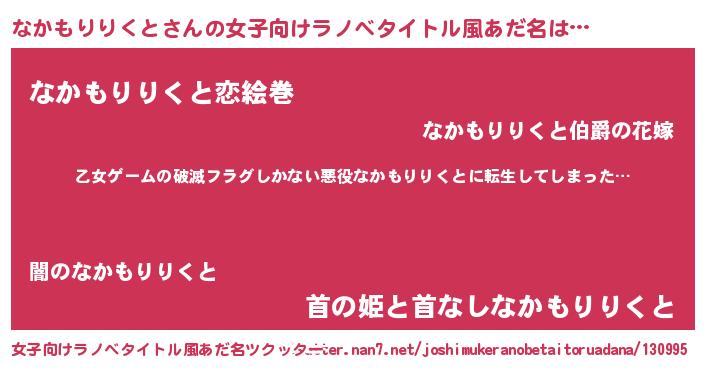 | 男性向けラノベタイトル風あだ名 | 『魔弾の王となかもりりくと』 |