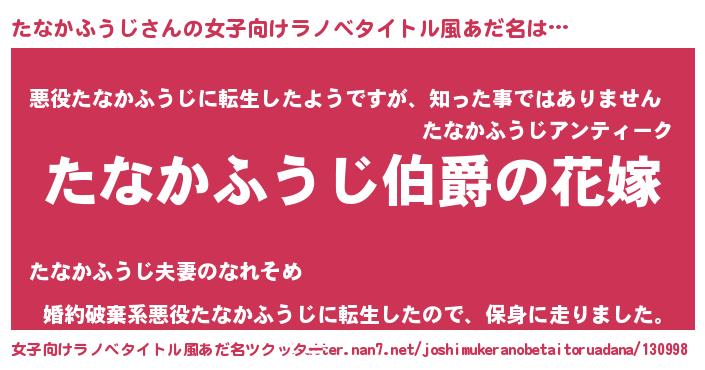| 男性向けラノベタイトル風あだ名 | 『うちの娘の為ならば、俺はもしかしたらたなかふうじも倒せるかもしれない。』 |