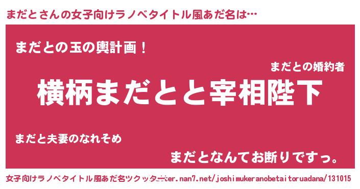 | 男性向けラノベタイトル風あだ名 | 『まだとに滅ぼされるだけの簡単なお仕事です』 |