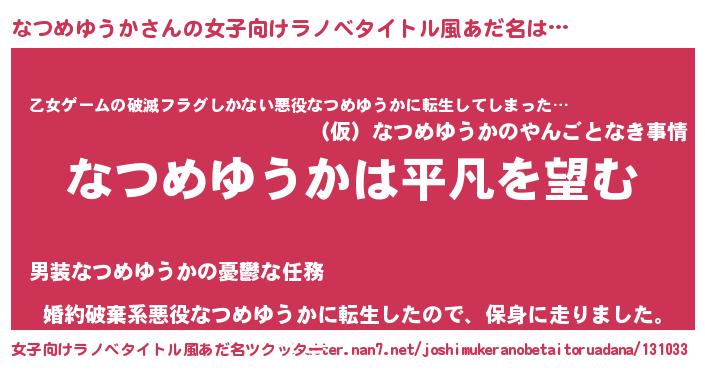 | 胡散臭い通販商品みたいなあだ名 | 『信頼と実績のサプリメント…その名も「なつめゆうか」』 |