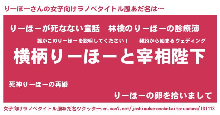 | 男性向けラノベタイトル風あだ名 | 『りーほーに滅ぼされるだけの簡単なお仕事です』 |