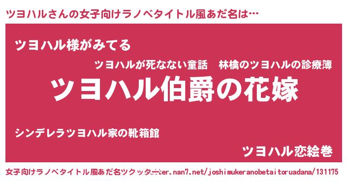 | 男性向けラノベタイトル風あだ名 | 『やはりツヨハルの青春ラブコメはまちがっている 』 |