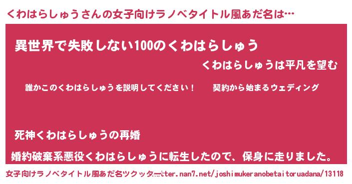 | 男性向けラノベタイトル風あだ名 | 『クワハラシュウアートオンライン』 |