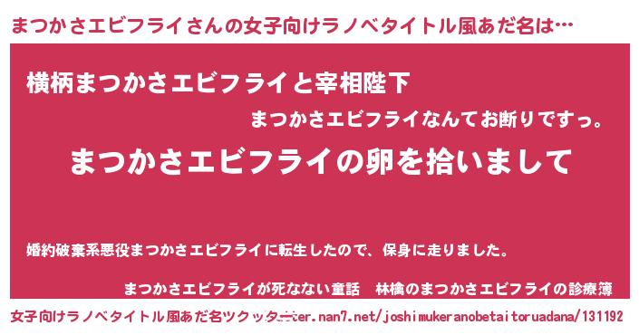 | 男性向けラノベタイトル風あだ名 | 『まつかさエビフライの嫁は女の子じゃないと思った?』 |