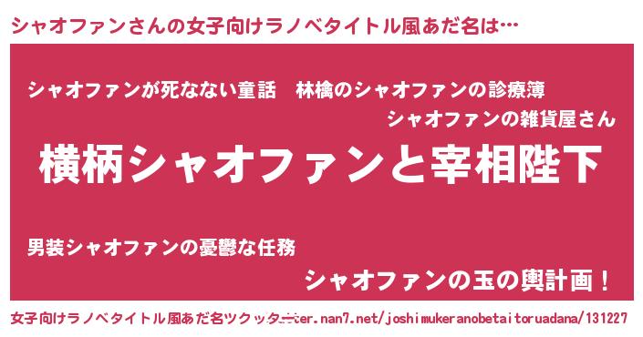 | 男性向けラノベタイトル風あだ名 | 『シャオファンに滅ぼされるだけの簡単なお仕事です』 |