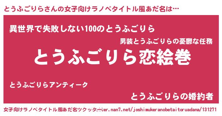 | 男性向けラノベタイトル風あだ名 | 『おまえをオタクにしてやるから、俺をとうふごりらにしてくれ! 』 |