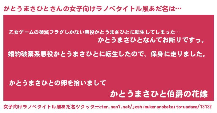 | 胡散臭い通販商品みたいなあだ名 | 『ハリウッド女優が絶賛した世界で10本だけ現存している希少なブランデー…その名も「かとうまさひと」』 |