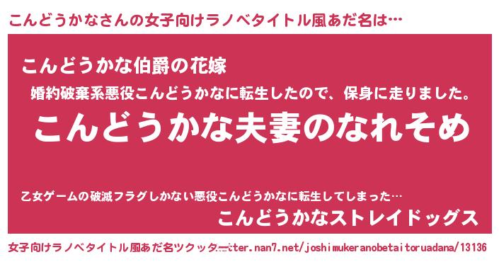 | 男性向けラノベタイトル風あだ名 | 『おまえをオタクにしてやるから、俺をこんどうかなにしてくれ! 』 |