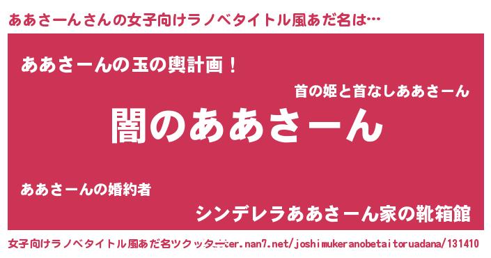 | 男性向けラノベタイトル風あだ名 | 『Re:ああさーんから始める異世界生活』 |
