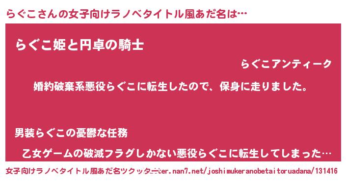 | 男性向けラノベタイトル風あだ名 | 『ラグコスレイヤー』『らぐこの憂鬱』 |