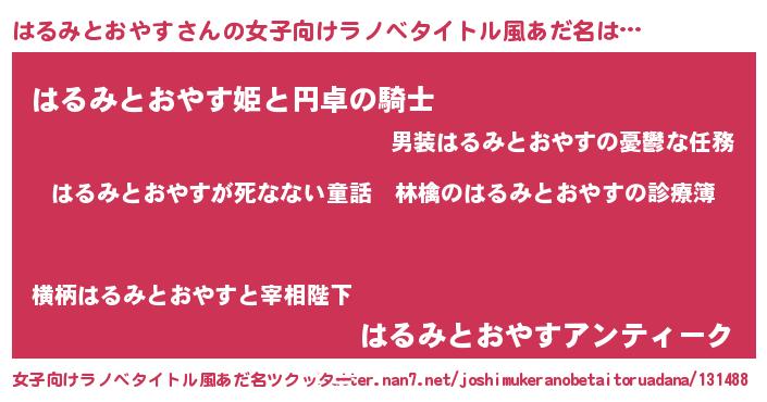 | 男性向けラノベタイトル風あだ名 | 『魔弾の王とはるみとおやす』 |