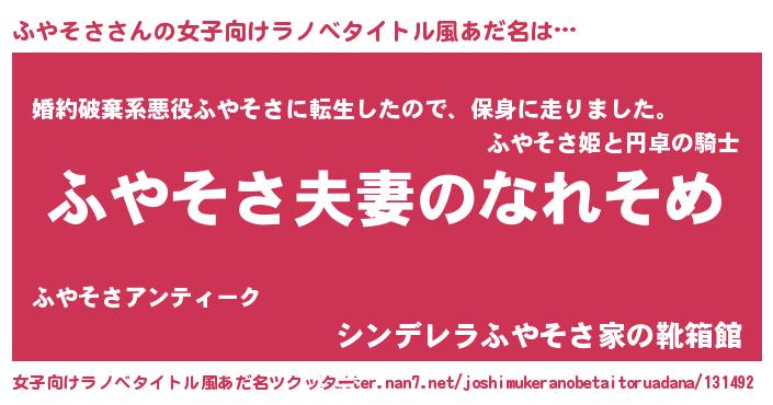 | 男性向けラノベタイトル風あだ名 | 『おまえをオタクにしてやるから、俺をふやそさにしてくれ! 』 |