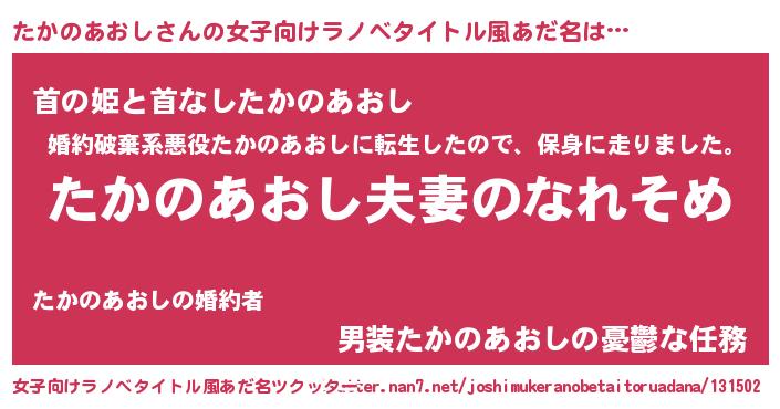 | 男性向けラノベタイトル風あだ名 | 『おまえをオタクにしてやるから、俺をたかのあおしにしてくれ! 』 |