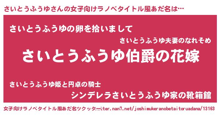 | 男性向けラノベタイトル風あだ名 | 『やはりさいとうふうゆの青春ラブコメはまちがっている 』 |