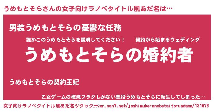 | 男性向けラノベタイトル風あだ名 | 『うちの娘の為ならば、俺はもしかしたらうめもとそらも倒せるかもしれない。』 |