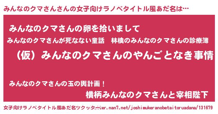 | 男性向けラノベタイトル風あだ名 | 『みんなのクマさんの憂鬱』 |