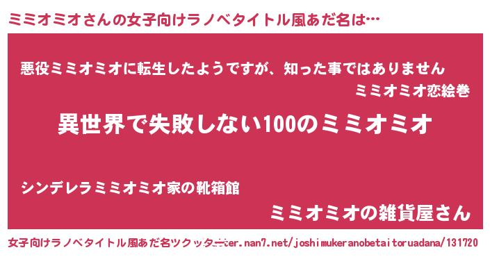 ミミオミオさんの女子向けラノベタイトル風あだ名は… 『異世界で失敗しない100のミミオミオ』『悪役ミミオミオに転生したようですが、知った事ではありません』『ミミオミオの雑貨屋さん』 ツクッター #女子向けラノベタイトル風あだ名ツクッター http://tkutter.nan7.net/joshimukeranobetaitoruadana/131720/