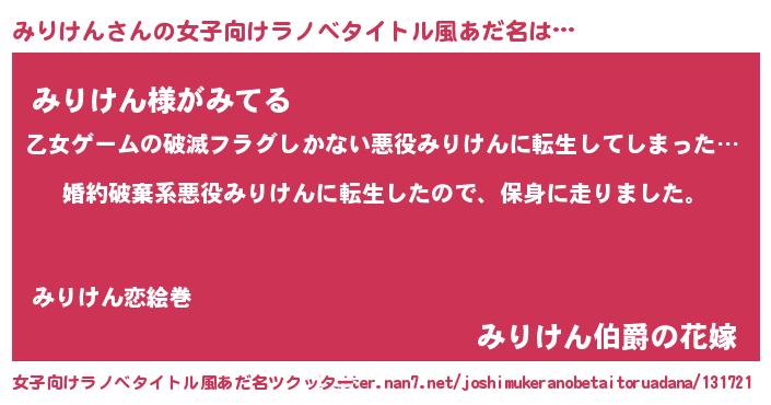 | 胡散臭い通販商品みたいなあだ名 | 『信頼と実績のサプリメント…その名も「みりけん」』 |