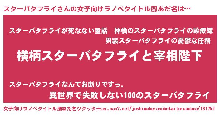 | 胡散臭い通販商品みたいなあだ名 | 『あなたにだけ特別に提供する100年もののヴィンテージワイン…その名も「スターバタフライ」』 |