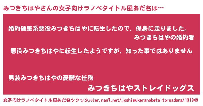 | 男性向けラノベタイトル風あだ名 | 『この素晴らしい世界にみつきちはやを!』 |