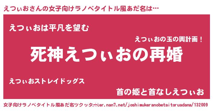 えつぃおさんの女子向けラノベタイトル風あだ名は… 『死神えつぃおの再婚』『えつぃおは平凡を望む』『首の姫と首なしえつぃお』 ツクッター #女子向けラノベタイトル風あだ名ツクッター http://tkutter.nan7.net/joshimukeranobetaitoruadana/132009/