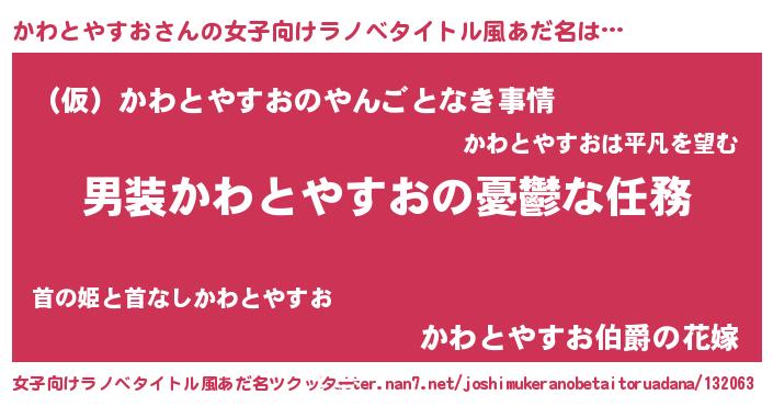 | 男性向けラノベタイトル風あだ名 | 『うちのかわとやすおが世界を掌握している!』 |