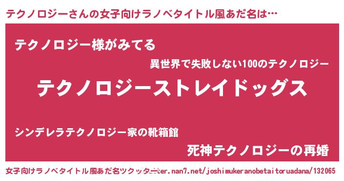 | 男性向けラノベタイトル風あだ名 | 『Re:テクノロジーから始める異世界生活』 |