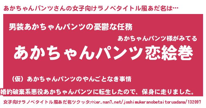 | 男性向けラノベタイトル風あだ名 | 『おまえをオタクにしてやるから、俺をあかちゃんパンツにしてくれ! 』 |