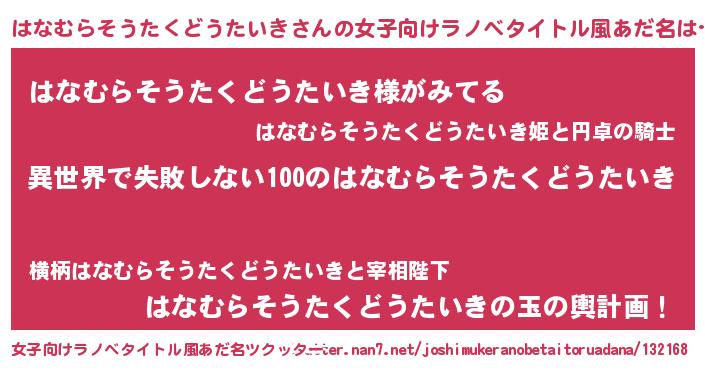 | 男性向けラノベタイトル風あだ名 | 『はなむらそうたくどうたいきという概念が存在しない退屈な世界 』 |