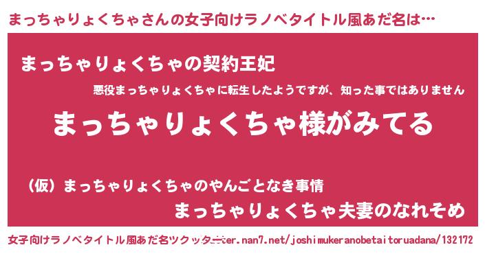 | 男性向けラノベタイトル風あだ名 | 『まっちゃりょくちゃの嫁は女の子じゃないと思った?』 |