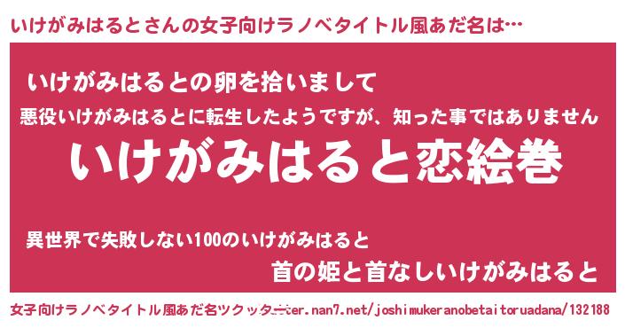 | 男性向けラノベタイトル風あだ名 | 『おまえをオタクにしてやるから、俺をいけがみはるとにしてくれ! 』 |