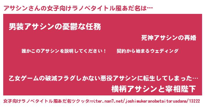 | 男性向けラノベタイトル風あだ名 | 『アサシンアートオンライン』 |