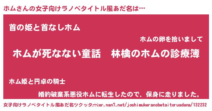 ホムさんの女子向けラノベタイトル風あだ名は… 『ホムが死なない童話 林檎のホムの診療簿』『首の姫と首なしホム』『婚約破棄系悪役ホムに転生したので、保身に走りました。』 ツクッター #女子向けラノベタイトル風あだ名ツクッター http://tkutter.nan7.net/joshimukeranobetaitoruadana/132232/