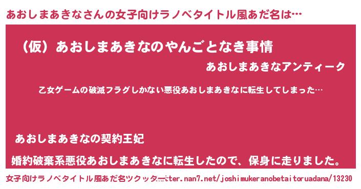| 男性向けラノベタイトル風あだ名 | 『魔弾の王とあおしまあきな』 |