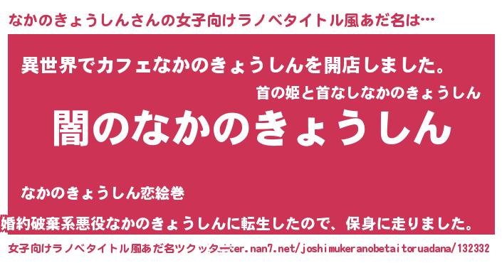 なかのきょうしんさんの女子向けラノベタイトル風あだ名は… 『闇のなかのきょうしん』『異世界でカフェなかのきょうしんを開店しました。』『婚約破棄系悪役なかのきょうしんに転生したので、保身に走りました。』 ツクッター #女子向けラノベタイトル風あだ名ツクッター http://tkutter.nan7.net/joshimukeranobetaitoruadana/132332/