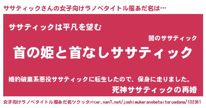 ササティックさんの女子向けラノベタイトル風あだ名は… 『首の姫と首なしササティック』『ササティックは平凡を望む』『死神ササティックの再婚』 ツクッター #女子向けラノベタイトル風あだ名ツクッター http://tkutter.nan7.net/joshimukeranobetaitoruadana/132361/