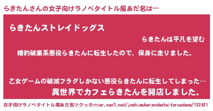 | 男性向けラノベタイトル風あだ名 | 『転生したららきたんだった件』 |