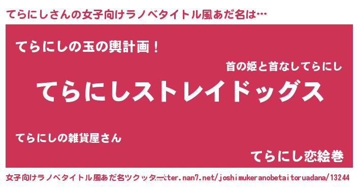 てらにしさんの女子向けラノベタイトル風あだ名は… 『てらにしストレイドッグス』『てらにしの玉の輿計画!』『てらにし恋絵巻』 ツクッター #女子向けラノベタイトル風あだ名ツクッター http://tkutter.nan7.net/joshimukeranobetaitoruadana/13244/