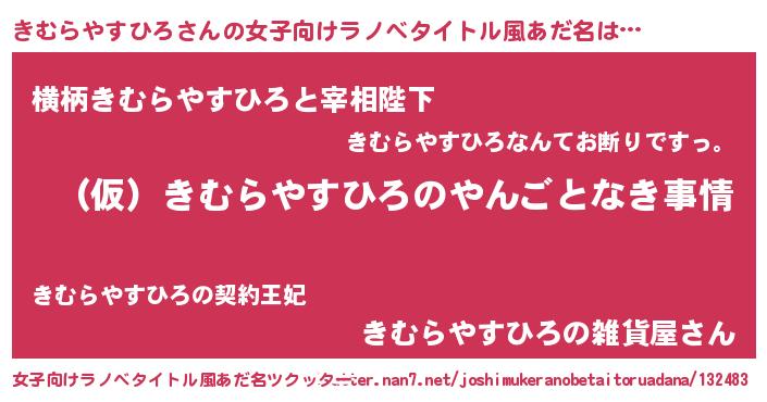 きむらやすひろさんの女子向けラノベタイトル風あだ名は… 『(仮)きむらやすひろのやんごとなき事情』『横柄きむらやすひろと宰相陛下』『きむらやすひろの雑貨屋さん』 ツクッター #女子向けラノベタイトル風あだ名ツクッター http://tkutter.nan7.net/joshimukeranobetaitoruadana/132483/