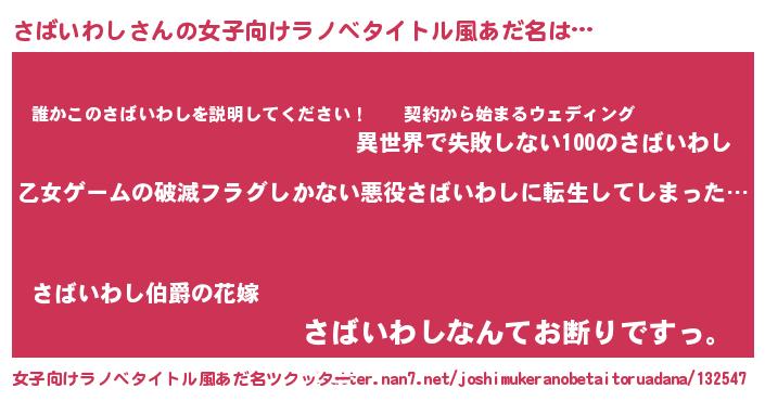 | 男性向けラノベタイトル風あだ名 | 『この素晴らしい世界にさばいわしを!』 |