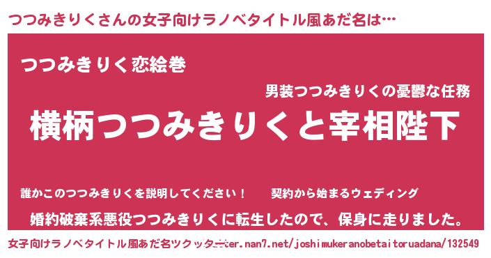 | 男性向けラノベタイトル風あだ名 | 『つつみきりくに滅ぼされるだけの簡単なお仕事です』 |