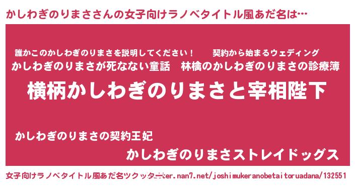 | 男性向けラノベタイトル風あだ名 | 『かしわぎのりまさに滅ぼされるだけの簡単なお仕事です』 |