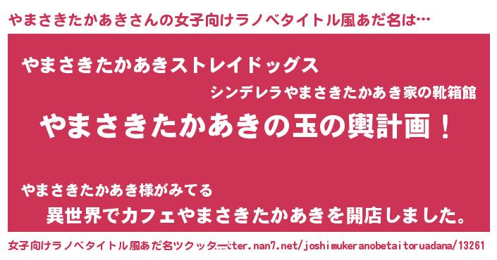 | 男性向けラノベタイトル風あだ名 | 『やまさきたかあき~年齢イコール彼女いない歴の魔法使い~』 |